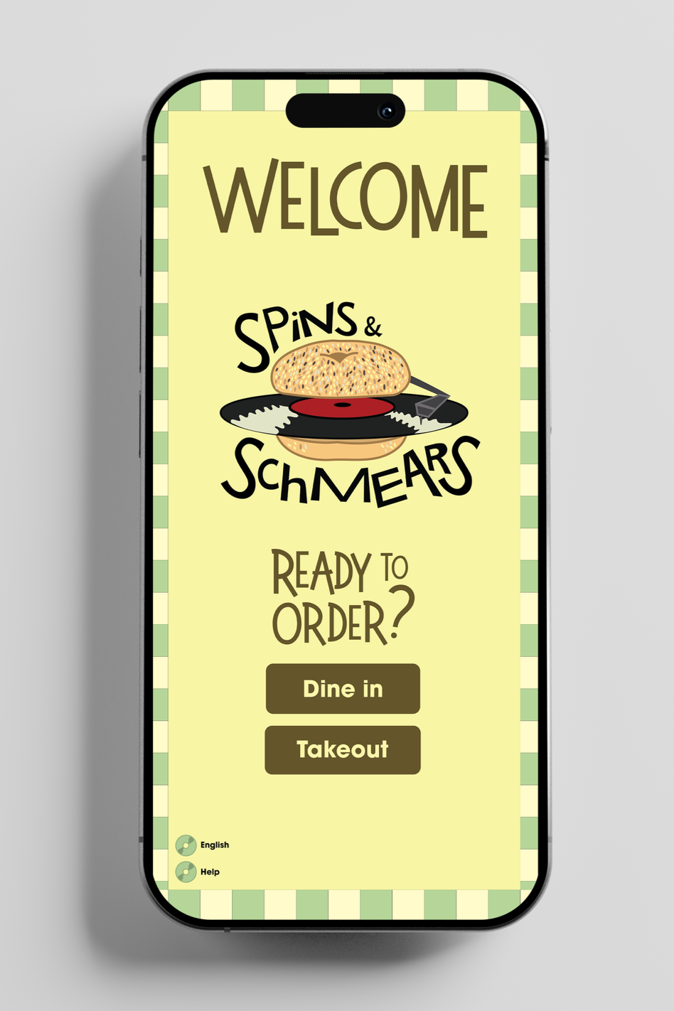 The welcome screen introduces users to the personality of Spins & Schmears through a playful logo. The interface is minimal, allowing the brand identity to take center stage while presenting two clear options. This simple entry point helps users immediately begin their ordering journey.