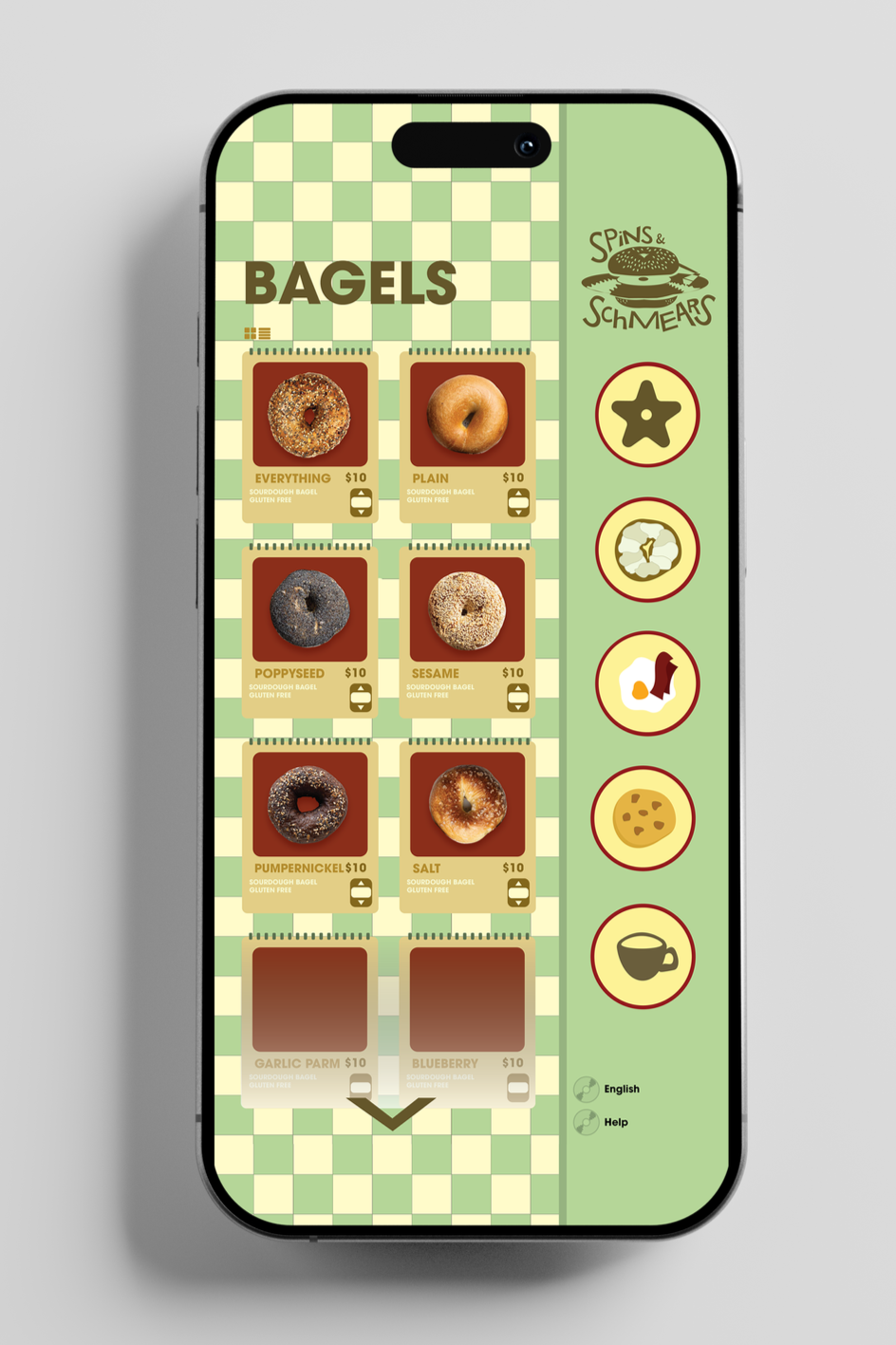 This screen focuses on purchasing individual bagels, presenting each option visually to make recognition quick and intuitive. The grid layout encourages exploration while keeping the interface clean and organized.