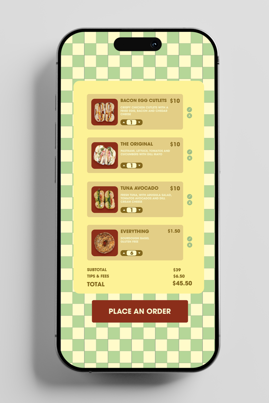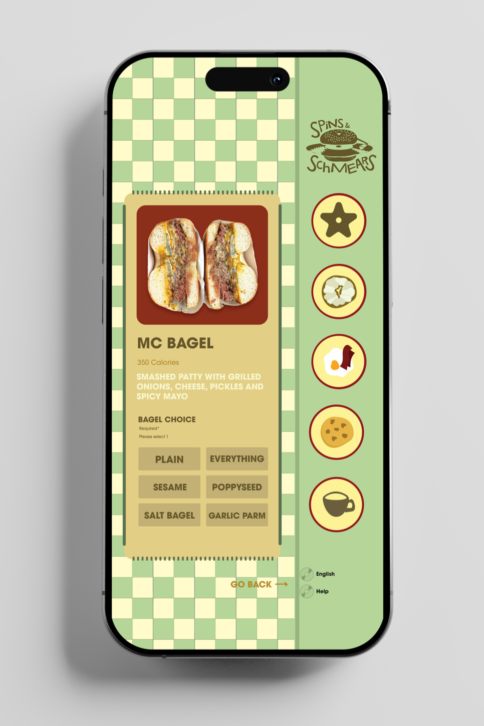 After selecting a sandwich, users can customize their order by choosing bagel varieties and other options. The layout prioritizes the food image while organizing customization choices into clear sections. Ensuring that customers maintain control over their order while keeping the experience efficient and easy to navigate.