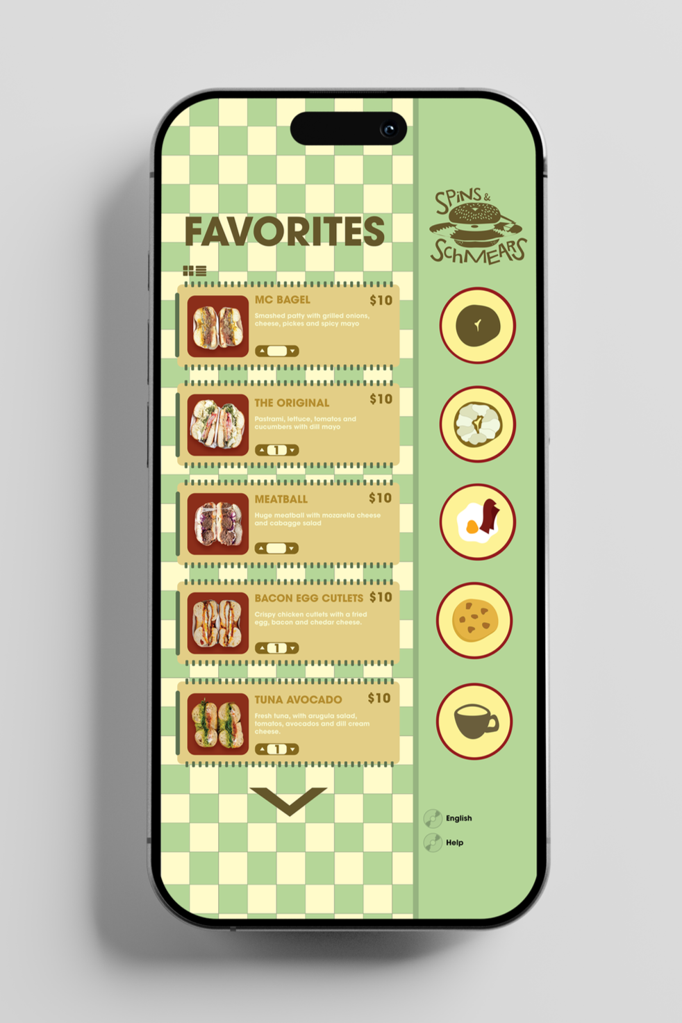 The Favorites screen highlights the shop’s most popular bagel sandwiches, helping users make quick decisions. Each item includes an image, price, and simple add-to-cart controls, while the vertical navigation allows easy browsing between menu categories.